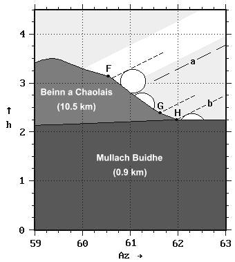 Figure 6 The Southernmost Pap, Beinn a Chaolais, seen from the summit of Cnoc Seandda at Loch Finlaggan (click for larger image). Points F to H are selected foresights, continued from Figure 5. The Moon’s centre disk rising paths are super-imposed on the profile, assuming a date of 1750 B.C. The highlighted band shows the range of the full Moon’s computed midwinter declinations one year before or after the Minor standstill. Rising positions marked are (a) centre disk path of the Minor standstill declination +(E - i), and (b) upper limb of the Sun rising at the the mid-quarter declination +16º.7. The upper limb of the full Moon at the midwinter standstill declination +(E - i + delta) is shown a short distance below point F. The lower limb of the Moon rising one day before or after the midwinter full Moon is indicated by point G, with the Moon emerging behind the mountain. |