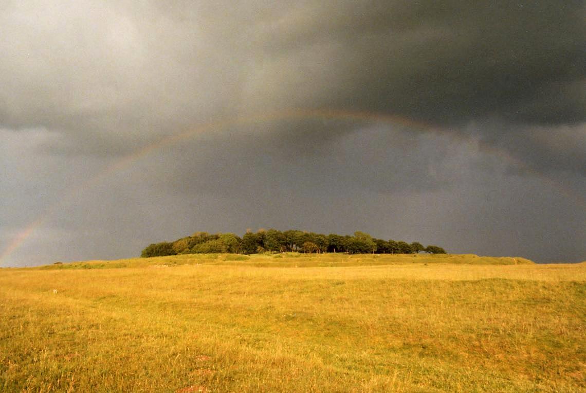 An afternoon rainbow frames the tree-topped hillfort of Badbury Rings, about 1 mile (1.6 kms) Northeast of the village of Shapwick. The fort is believed to date from the Iron Age period in Britain (ca. 800 BC - 50 AD). Oval in plan, the fort covers an area of about 7.2 ha (18 acres) and is surrounded by three concentric ditches and ramparts. The two inner ditches survive to a depth of about 20 ft (6 m); the outermost is much less substantial. The site has not been excavated.