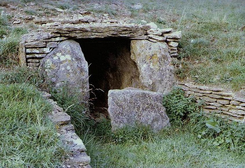 The entrance passage, some 20 ft (6 m) long by 4 ft (1.3 m) wide, approaches the chamber from the West then bends Southwards through a severe 80° angle before reaching the chamber, which is partly blocked by a portal stone.
