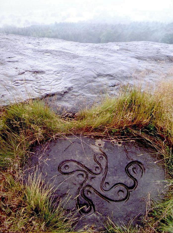 The stone has a double outline of a swastika, with ten cups fitting within the five curved arms. The design is similar to art of the Celtic Iron Age period, so the carving is likely to be later than the majority of other carvings on the moor.