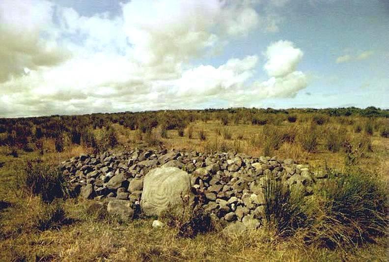 This cairn was saved from total destruction in 1982, although by the time it was excavated, three-quarters of it had already been damaged by bulldozing. The present appearance of the site - including the cairn's oval shape - is the result of restoration, much of which is conjectural.