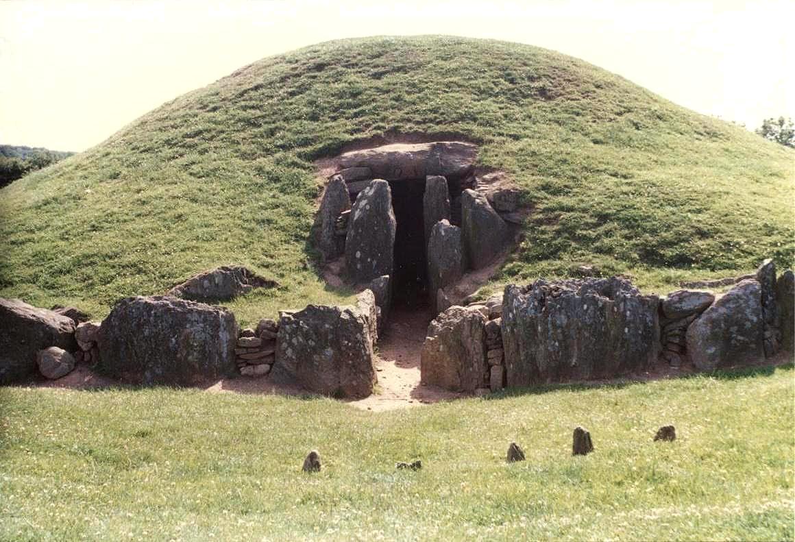 The "hill of the dark grove" is a passage-grave set within a circular mound 85 ft (26 m) in diameter. The mound is held in place by a revetment of large stones. The passage into the mound is 23 ft (7 m) long and roofed. It opens into a polygonal shaped chamber of six upright stones at the centre of the mound. A wallstone inside the chamber has a spiral carving on its face. A single pillar of stone stands inside the chamber and since it serves no structural purpose, it presumably had a ritual significance. Excavations at the site between 1925 and 1929 found cremated and unburnt fragments of human bone within the chamber and passage.