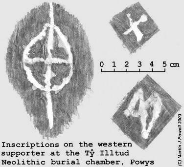The Ty Illtud chamber measures 7 ft (2.2 m) by 4 ft (1.3 m) and is positioned slightly offset from the centre of its enclosing mound. The inner faces of the chamber slabs are decorated with over sixty faint symbols, mainly crosses and lozenges (see selection of graphite rubbings). These probably date from medieval times and were perhaps an attempt to exorcise the paganism of the site. The capstone slopes downward towards the entrance and is only supported by the two side slabs. A large vertical slab 6 ft (1.8 m) long (visible in the foreground) appears to be the remnant of a forecourt-type structure.