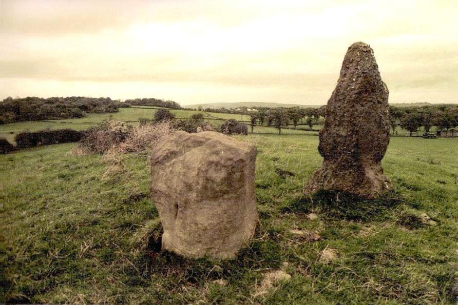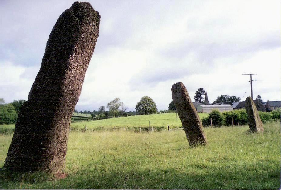Three stones of conglomerate sandstone stand in a line 39 ft (12 m) long in a field beside the village of Trellech (also spelled Trelleck or Trelech, meaning "village of stones"). They all lean at various angles, although we may assume that they were originally upright. The row is aligned in a NE-SW direction. The tallest stone, at the South-west, is 11 ft (3.3 m) tall. The central stone has been shaped by hand and it has two large circular hollows (known as cup-marks) on its South-western face [Ast]