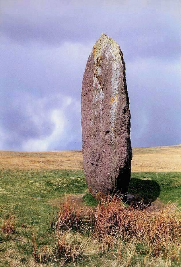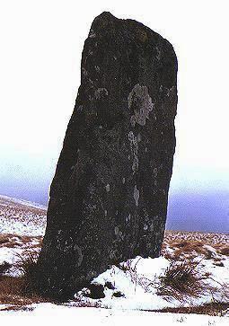 A 12 ft (3.6 m) high monolith of sandstone conglomerate stands on the often-marshy ground of the Llia Valley in the Brecon Beacons National Park. The stone can clearly be seen against the skyline when approaching from the South of the valley. It is orientated in a North-South direction, roughly in line with the valley. The stone is assumed to be of Bronze Age date, and has not been excavated. Two faint inscriptions in the lower right half of the stone, possibly in Roman and Ogham (Primitive Irish) scripts, were identified in 1922. A Roman road called Sarn Helen passes about 1180 ft (360 m) to the East of the stone.