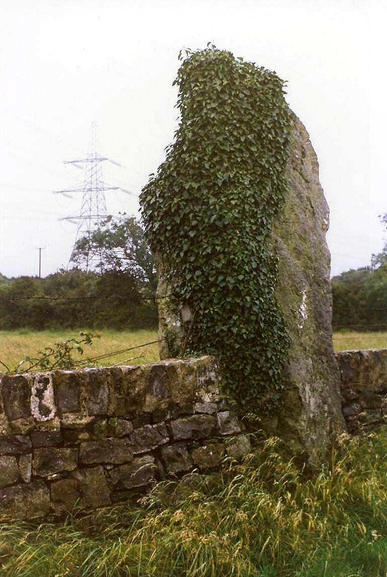 One of around thirty or so standing stones on the Isle of Anglesey, this particular example is incorporated into a field wall alongside the minor road between the villages of Maenaddwyn and Capel Coch. About two-thirds of its surface was covered in ivy at the time of the author's visit in July 1987.