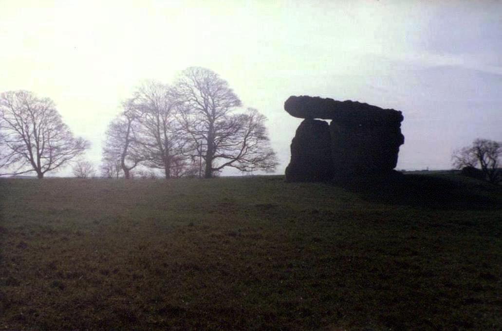 Four mudstone slabs stand at the Eastern end of a much-ploughed down long mound, with three uprights forming a rectangular chamber some 6½ ft (2 m) long by 5 ft (1.5 m) wide. Human remains and pottery were found in the chamber in 1875. The capstone is pitched upwards slightly towards the Eastern end. There is a hole through the rear stone of the chamber, through which the spirits of the dead are said to have flown.