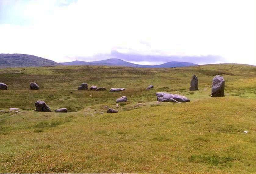 Situated on a low saddle overlooking Conway Bay, this embanked stone circle is 85 ft (26 m) in diameter and originally comprised thirty stones, but only ten are now standing. There is a gap in the circle at the WSW, which is flanked by two large portal stones.