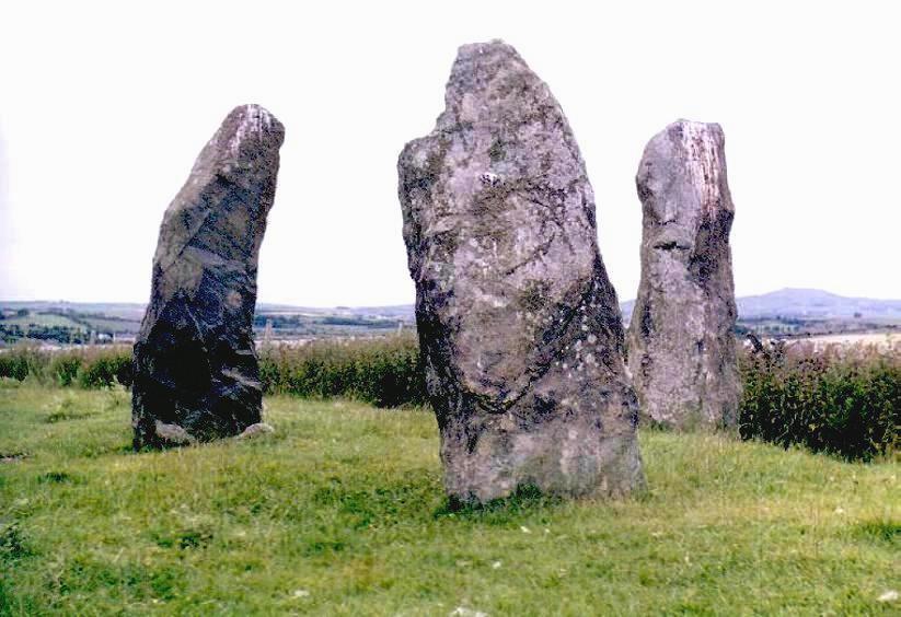 Looking like three old men in conversation, the Meini Hirion ("tall stones") are set in a peculiar triangular formation, the sides of the triangle so formed are 11 ft (3.4 m) by 8 ft (2.4 m) by 9½ ft (2.9 m). They stand between 6 ft (1.9 m) and 7 ft (2.1 m) high.
