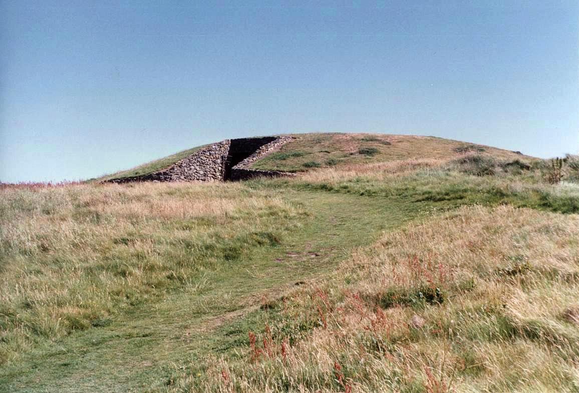 Set high upon a headland overlooking Trecastle Bay, about 1½ miles (2½ km) South-east of Rhosneigr, is a restored Neolithic chambered tomb of the passage-grave type. Before its restoration, the monument was ruinous and open to the sky, much like the present-day appearance of tombs such as Din Dryfol (see Page 3) and Presaddfed (see below). Much of the tomb's destruction took place during the eighteenth century, when it was used as a stone quarry.