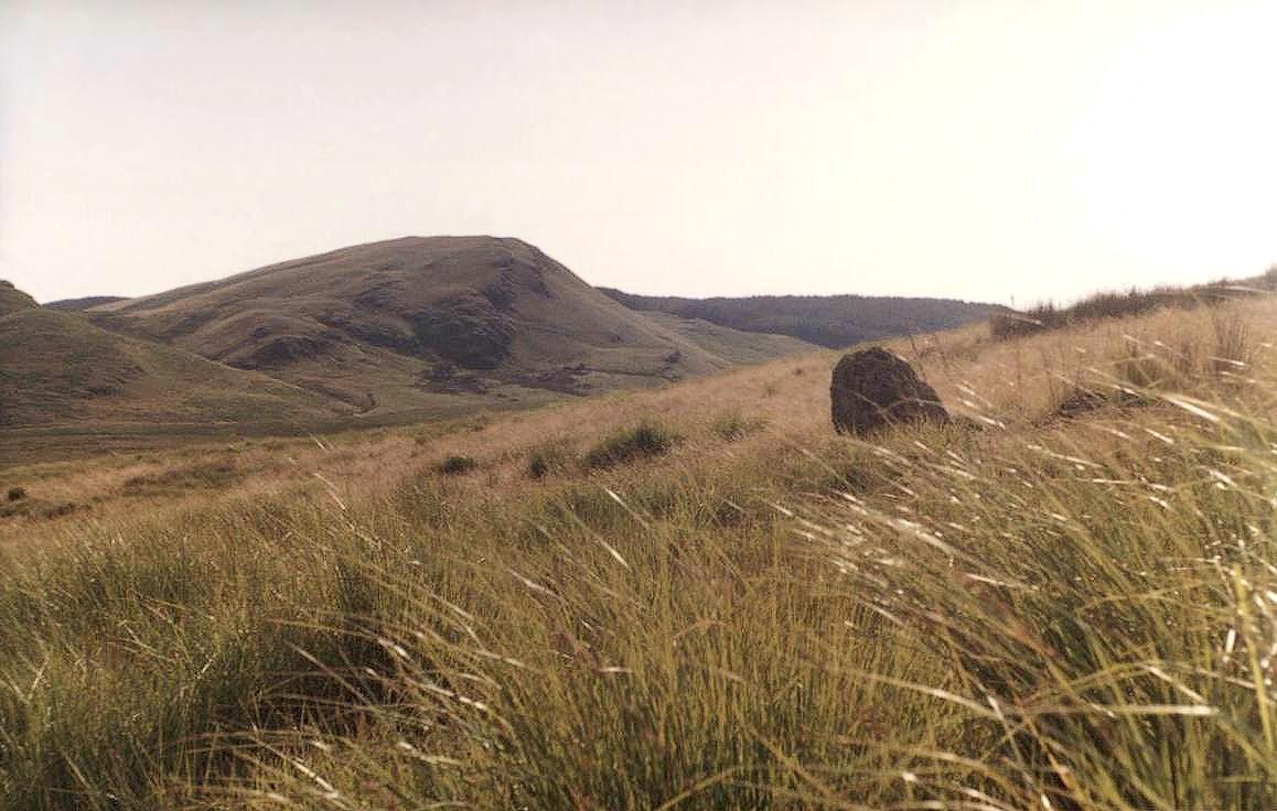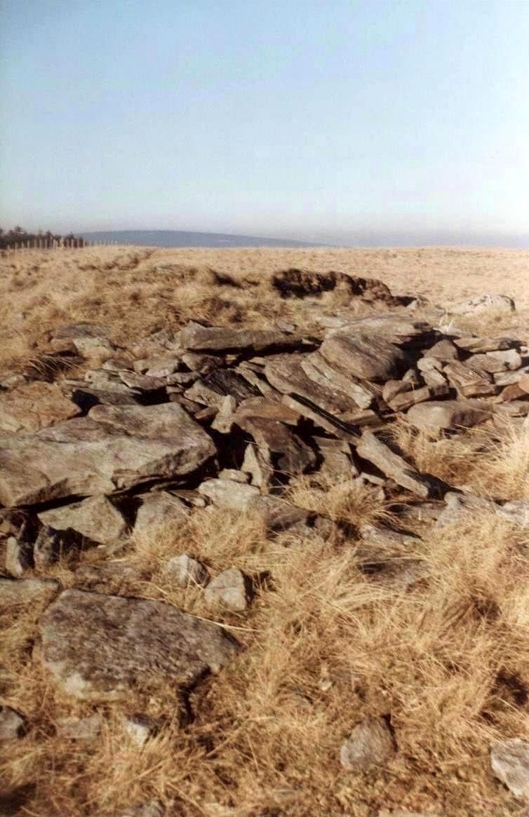 About 9 ft (2.8 m) from the cairn's South-eastern edge is a small upright block, which may have been deliberately placed - a so-called outlier. It may have been a marker to indicate the cairn's position to passers-by lower down the ridge, or perhaps it indicated an astronomical event seen from the cairn's centre, such as the most Southerly moonrise over the distant horizon [Ast]