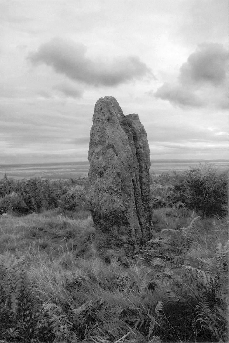 The two standing stones were once the most visible part of the monument when approached from the summit of the hill, but today they can only be seen from close range due to the tall vegetation. An outlier at the circle's North-eastern side is about 6 ft (1.8 m) tall, 3 ft (1 m) wide and 1½ ft (0.5 m) thick; a small tree now stands beside it. The second menhir is further uphill about 180 ft (55 m) to the North-west; it is 7 ft 3 in (2.2 m) tall by 3 ft (1 m) wide by 1 ft 4 in (0.4 m) thick, leaning North-eastwards into a slight pit. Two recumbent stones are positioned to the North-west of the circle, on the same NW-SE alignment as the standing pair.