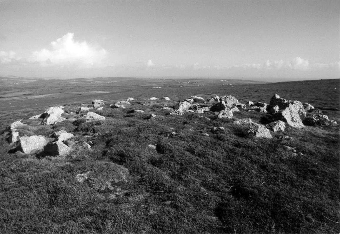 Occupying much of the narrow ridge of the Down are around twenty or so round cairns dating from the Bronze Age period. This particular example is one of the better preserved of the group; it is about 30 ft (9.1 m) in diameter and the stones stand to a height of about 1 ft 9 in (0.55 m). Archaeologists refer to it as a platform-cairn because it was constructed on a man-made stone platform which stood about 1 ft (0.3 m) above the natural surface of the moorland.